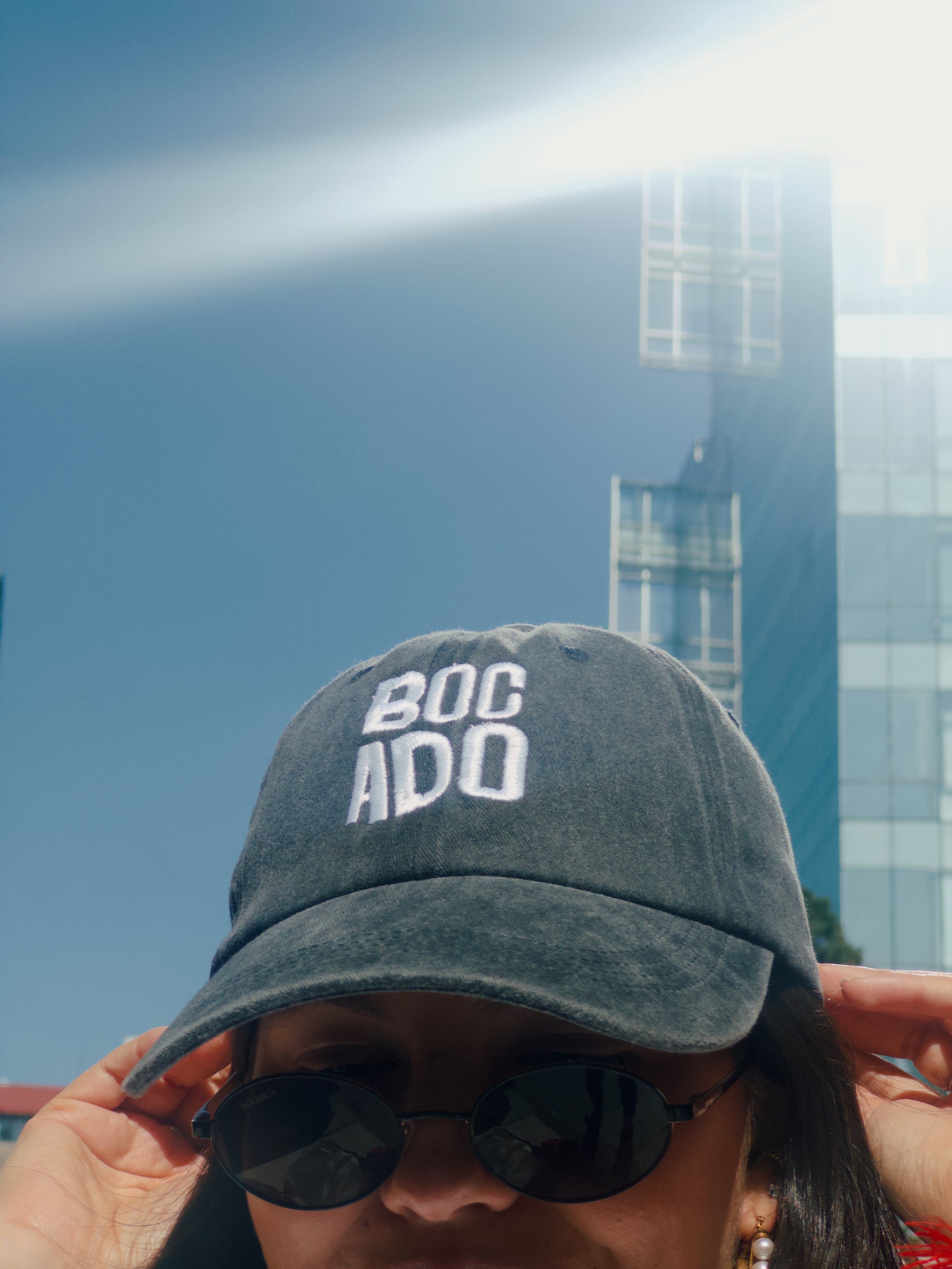 Gorra negra de gabardina desgastada, bordado Bocado en la parte frontal y panadero en la parte trasera, banda ajustable